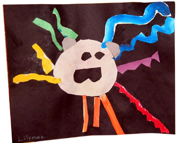 Homer Youth Art On-LineColor Wheel Lions With this project, the 2nd graders created "Color Wheel Line Lions", to explore color and line. They painted lines of primary colors, (red, blue and yellow) then mixed primary colors to make secondary colors, (green, orange and purple.) Next, they mixed complementary colors to make a neutral color for the face. The order of the colors of the mane is representative of the color wheel. Students also used different types of lines in the mane, wavy, curvy, zig zags and straight. Artist: Lilymae, 2nd grade. Previous | Home | Next |