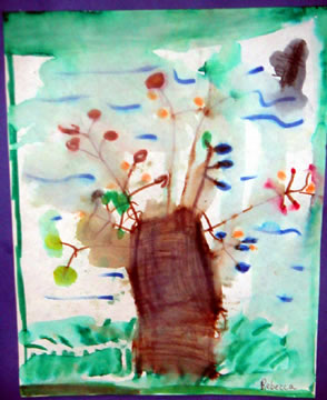 This tree has a very strong trunk and is standing in a field of grass. Perhaps that is a squirrel perched near the top.
