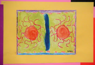This simple design of two suns also resembles a domino in bright colors. The student gives a good example of the balance in symmetrical art.